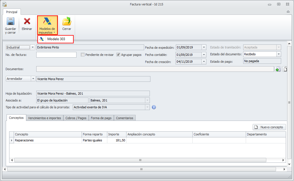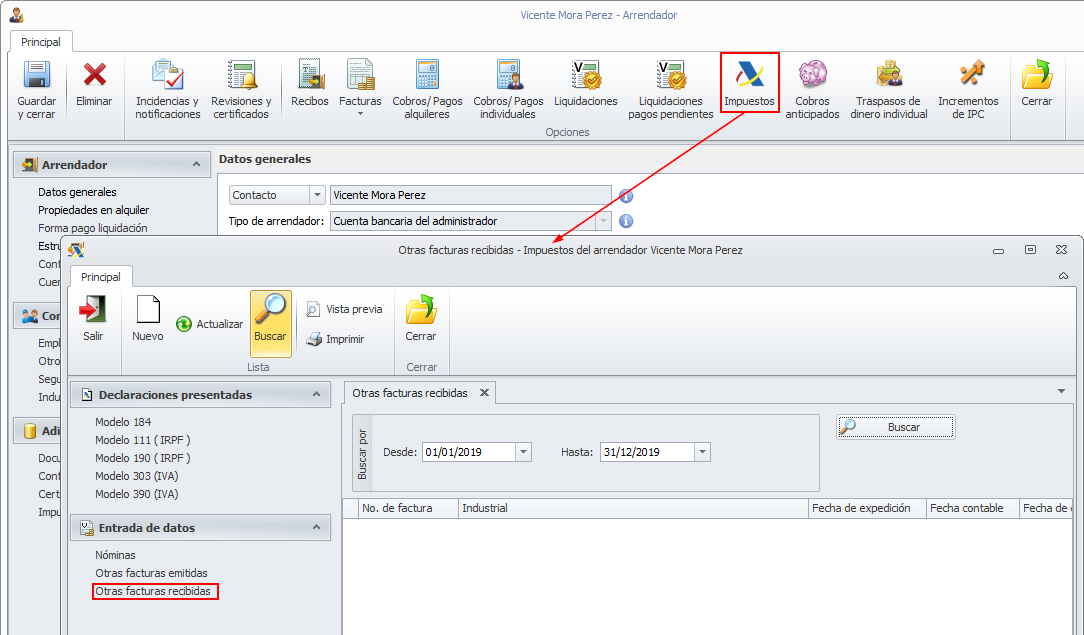 Acceso al modelo de impuestos desde las facturas de industriales y "Otras facturas recibidas del arrendador"