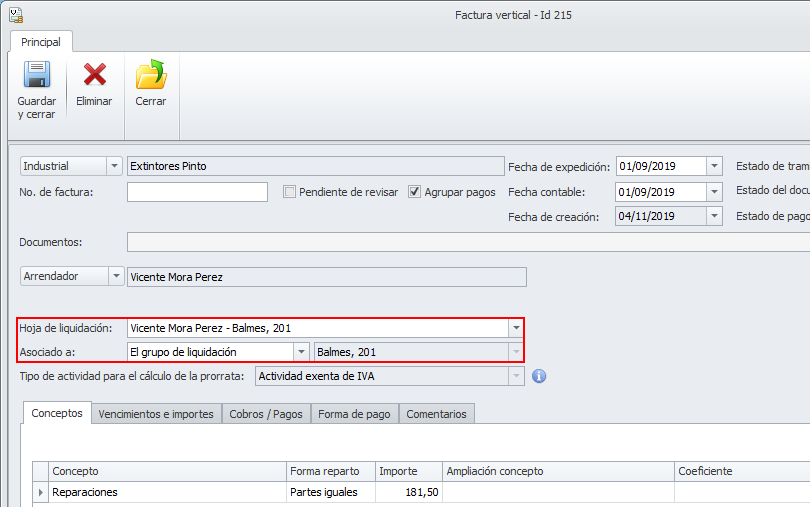 Cambio de hoja y grupo de liquidación en las facturas de industriales y "Otras facturas recibidas del arrendador"