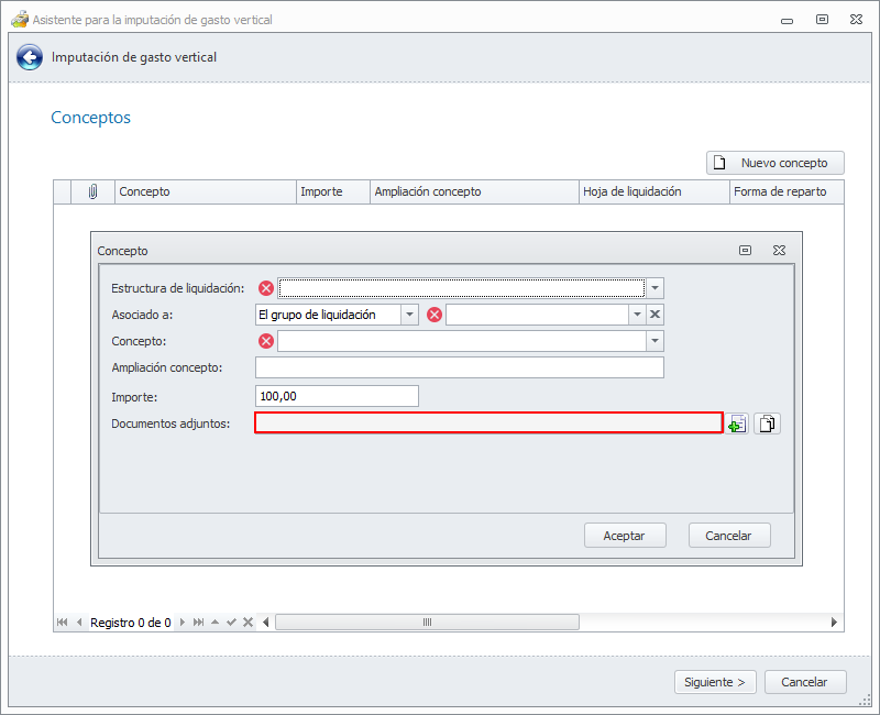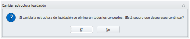 Al cambiar la hoja y/o grupo de liquidación, se muestra el siguiente mensaje, advirtiendo de que se eliminarán los conceptos de gasto. En caso de continuar con el cambio, se deberán reintroducir.