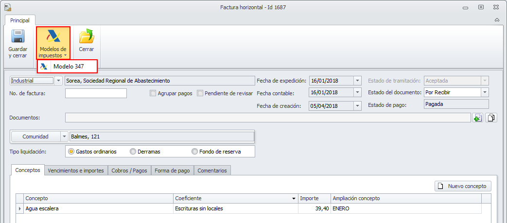 Acceso al modelo de impuestos desde las facturas de industriales y "Otras facturas recibidas de la comunidad"