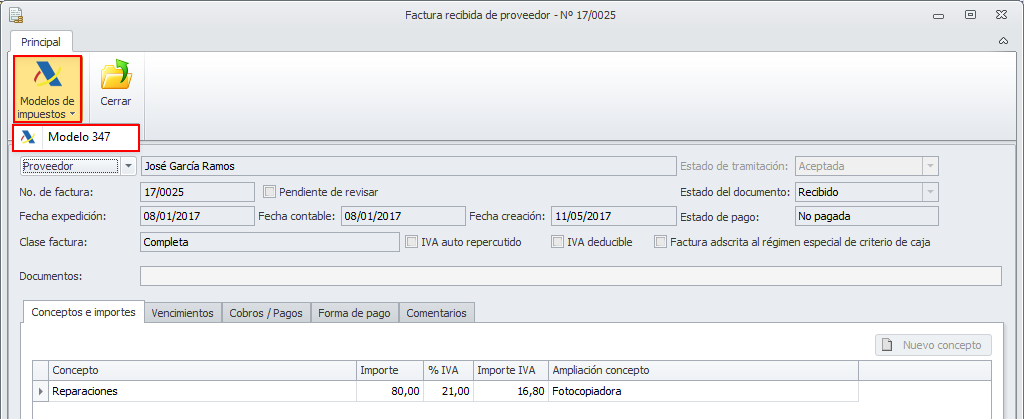 En el caso de que una factura (ya sea de proveedor o de Otras facturas recibidas del administrador) esté incluida en alguna declaración de la AEAT se incorpora un botón Modelos de impuestos que permite abrir la ficha del modelo en que se encuentra esta factura.