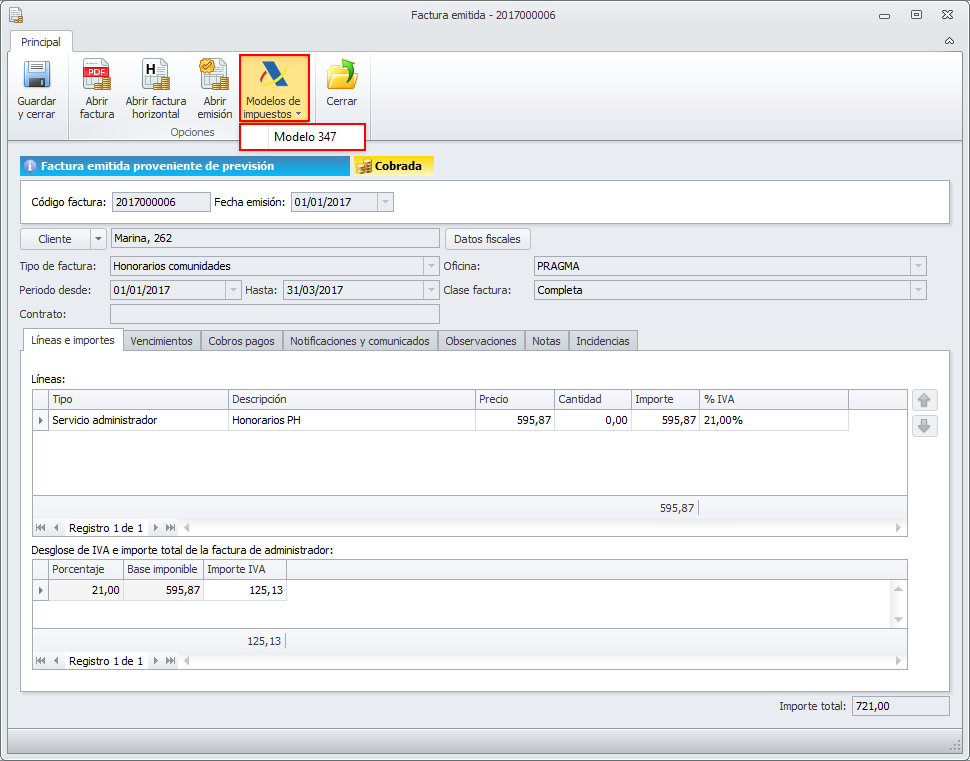 En el caso de que una factura emitida del administrador esté incluida en alguna declaración de la AEAT se incorpora un botón Modelos de impuestos que permite abrir la ficha del modelo en que se encuentra esta factura.
