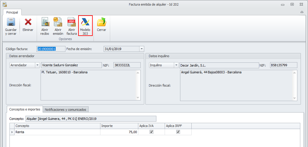 En el caso de que una factura emitida del arrendador esté incluida en alguna declaración de modelo 303 de la AEAT se incorpora un botón Modelo 303 que permite abrir la ficha del modelo en que se encuentra esta factura.