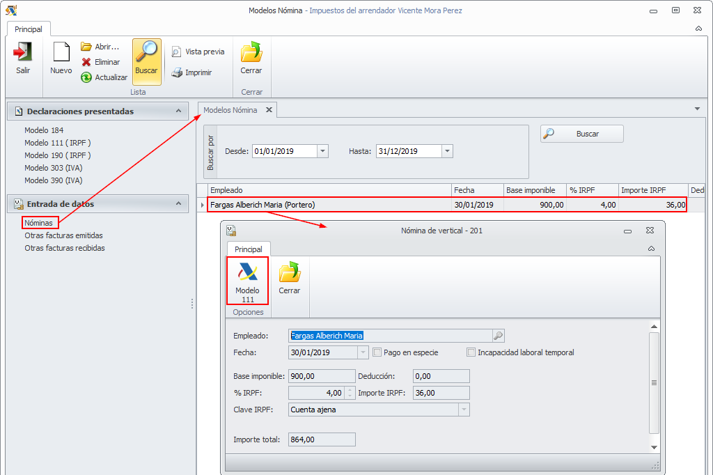 Acceso al modelo de impuestos desde las nóminas del arrendador