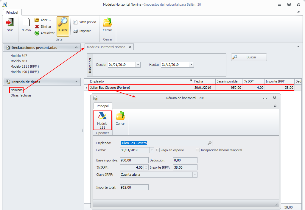 En el caso de que un registro de nómina esté incluida en algún modelo 111 de la AEAT se incorpora un botón Modelo 111 que permite abrir la ficha del modelo en que se encuentra esta factura.