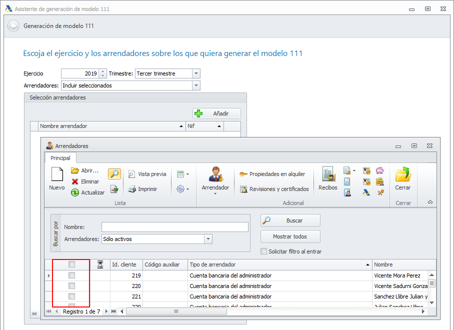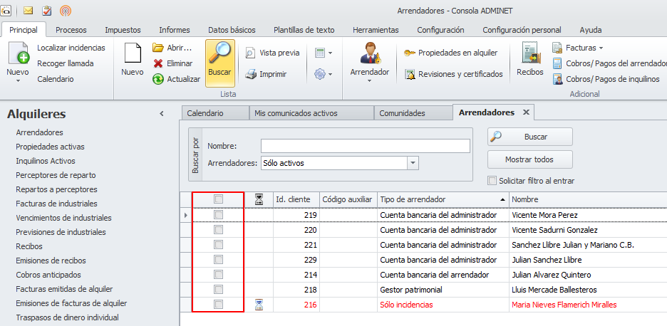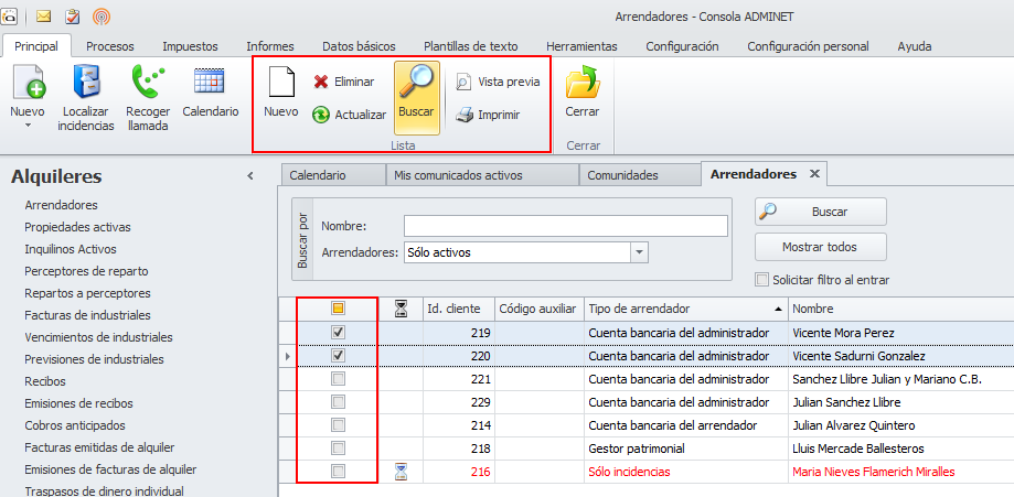 Se ha modificado la vista de arrendadores y perceptores, incluyendo la posibilidad de realizar una selección múltiple.