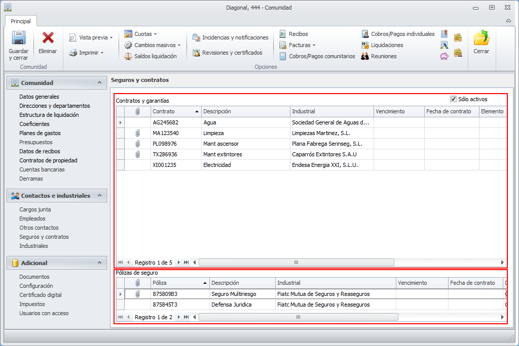 Se ha modificado la ventana de Seguros y contratos de las comunidades y macro-comunidades para dar más espacio a la lista de Contratos y garantías, en detrimento de Pólizas y seguros.