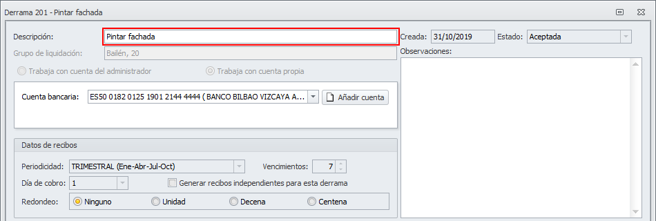 Se permite modificar la descripción de la derrama aunque haya sido aceptada. Al acceder a la ficha, la descripción se puede editar.
