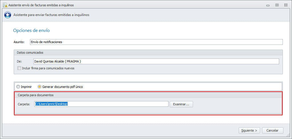 Si se escoge Generar documento pdf único, se solicita al usuario que indique la carpeta en la que desea guardar el archivo pdf.