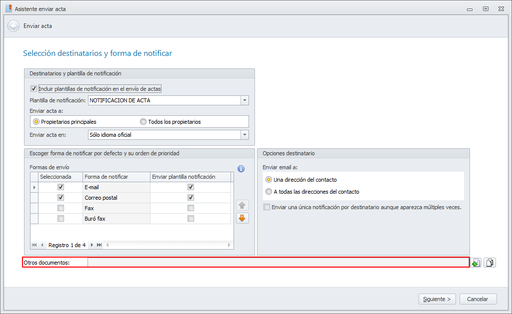 Se ha añadido la posibilidad de añadir documentos en el envío del acta a los copropietarios. La selección de los documentos a adjuntar se efectúa en la primera ventana del asistente de envío de actas.