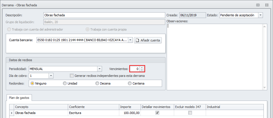 Al aprobarse, se le podrán vincular facturas y gastos. Para que se puedan generarán cuotas se deberá volver a entrar en la derrama y añadir vencimientos.
