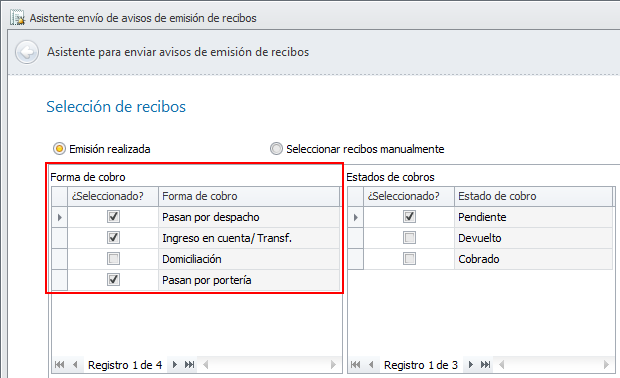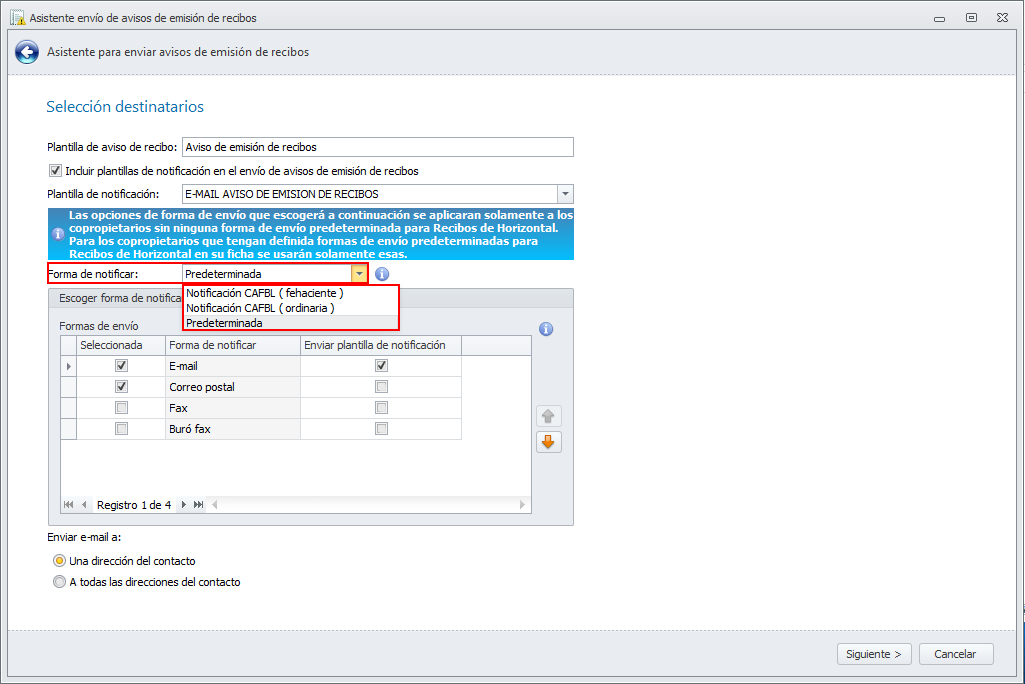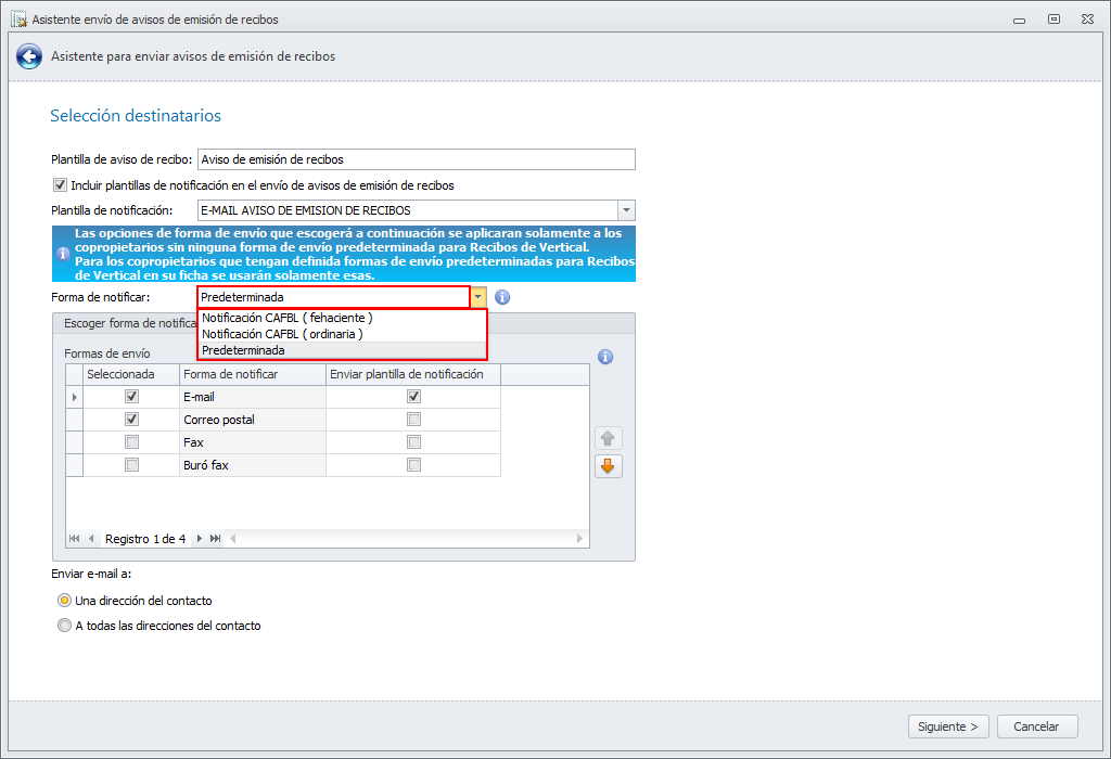 Se ha modificado el asistente de Envío de avisos de emisión de recibos para incluir la opción de notificar a través de Notificaciones CAFBL.