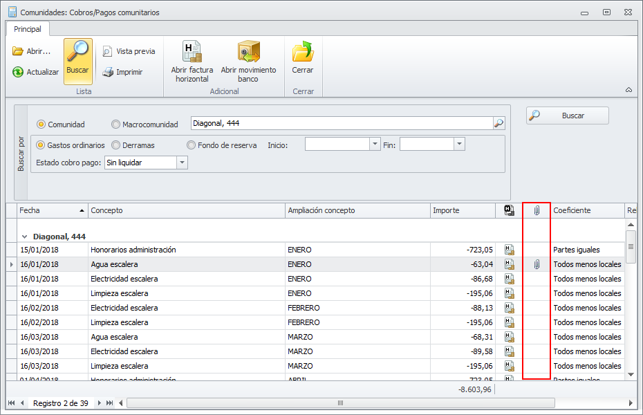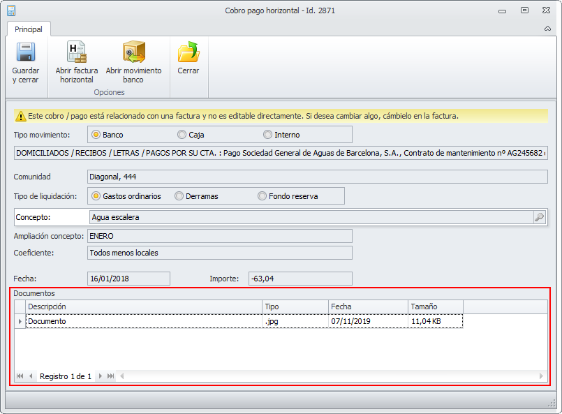 En la ficha de los gastos e ingresos comunitarios, cobros y devoluciones de recibo y gastos e ingresos individuales se ha añadido un cuadro para mostrar y permitir adjuntar documentos.
