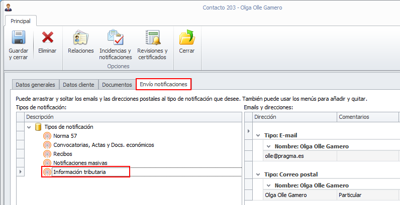 En la pestaña Envío notificaciones de las fichas de contactos e industriales se ha cambiado el nombre del tipo de notificación Informe impuestos por Información tributaria.