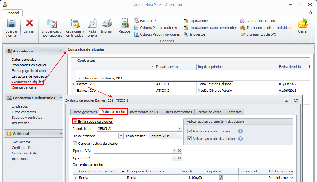 Se ha añadido una nueva casilla en la ficha del contrato de alquiler que permite, desactivándola, omitir la emisión del recibo de alquiler a ese contrato de propiedad.