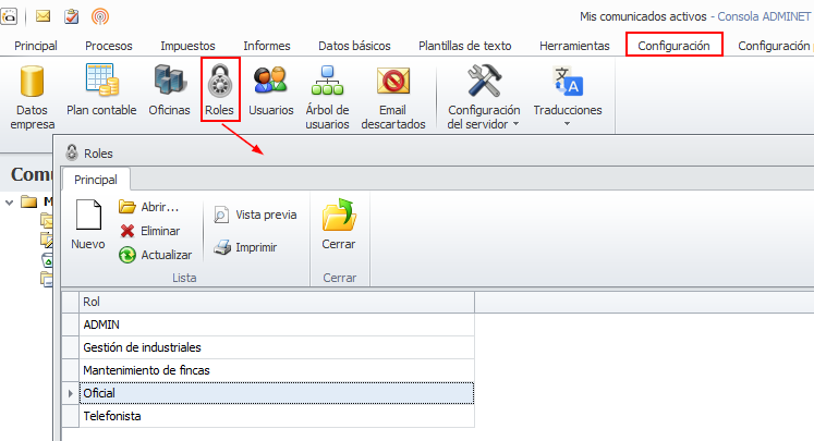 Los permisos se controlan desde el botón Roles del menú Configuración.