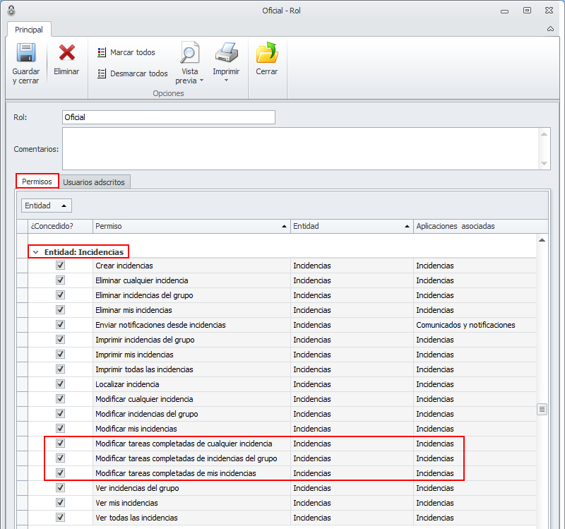 Una vez se accede a cualquier rol, en la pestaña Permisos se indica qué acciones se permiten o restringen. Estos nuevos permisos se encuentran en la entidad Incidencias. Las puede ver remarcadas en la siguiente imagen. Con ellas se puede restringir la posibilidad de modificar tareas (propias, del grupo de trabajo o todas) una vez han sido marcadas como completadas.