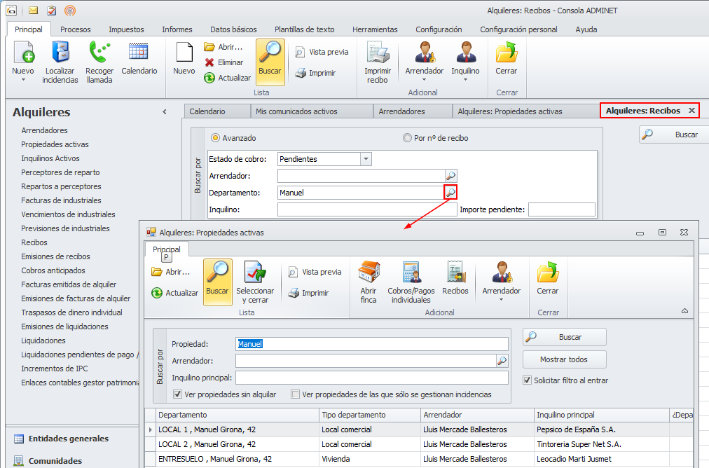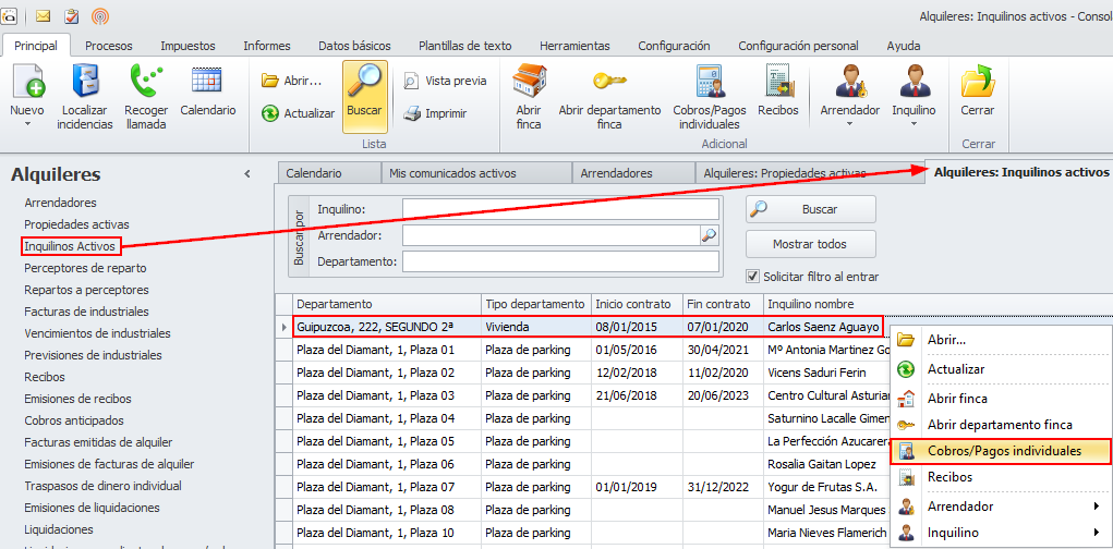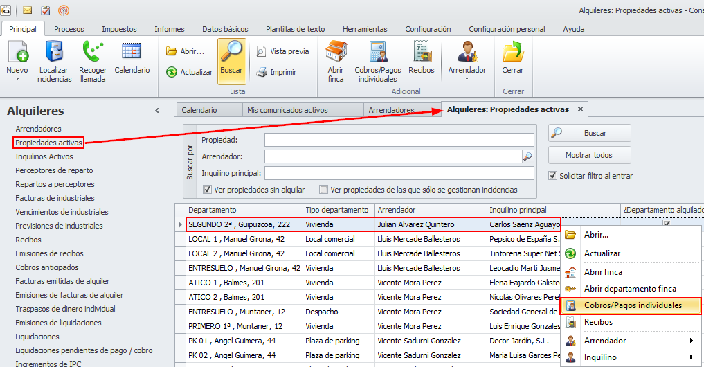 También se puede acceder a los cobros pagos individuales desde la opción Propiedades activas del apartado Alquileres.