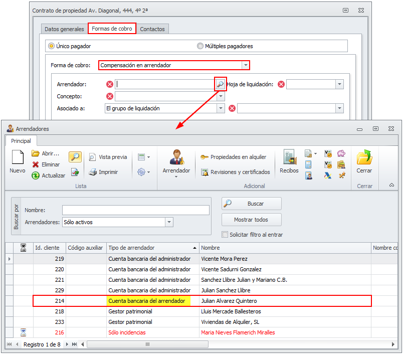 Al escoger la forma de cobro "Compensación en arrendador", se permite elegir arrendadores que se administran con cuenta bancaria del arrendador