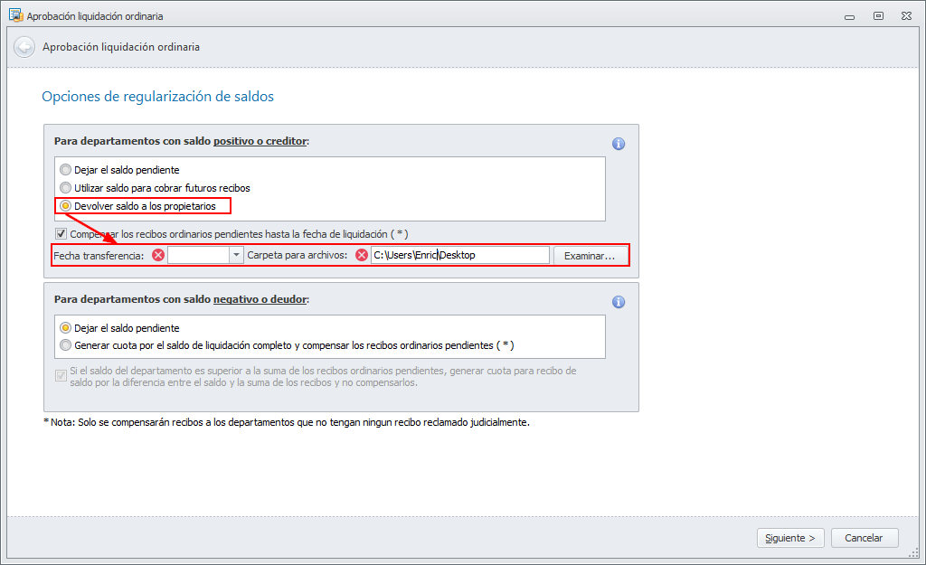 Se ha modificado la ventana del asistente de aprobación de liquidación para incorporar una nueva opción que permita devolver los saldos positivos a los propietarios. Al activase, se solicita la fecha para la ejecución de las transferencias y la carpeta dónde guardar el fichero para enviar a la entidad bancaria.
