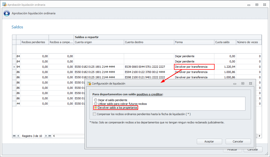 En aprobación de liquidación permitir devolver saldo positivo a los propietarios