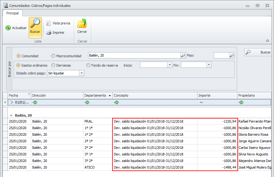 En la ventana siguiente, se muestran los departamentos con sus saldos individuales y la operación a realizar con cada uno de ellos. haciendo doble clic sobre la línea se permite cambiar la operación para ese propietario.
