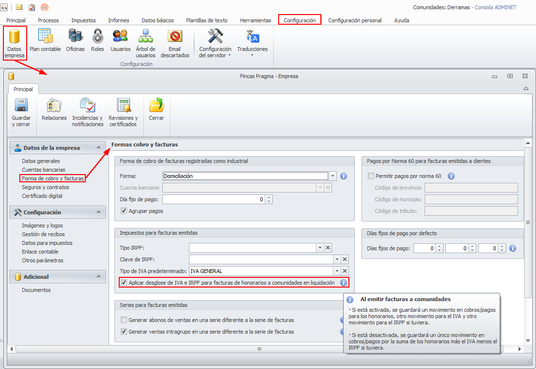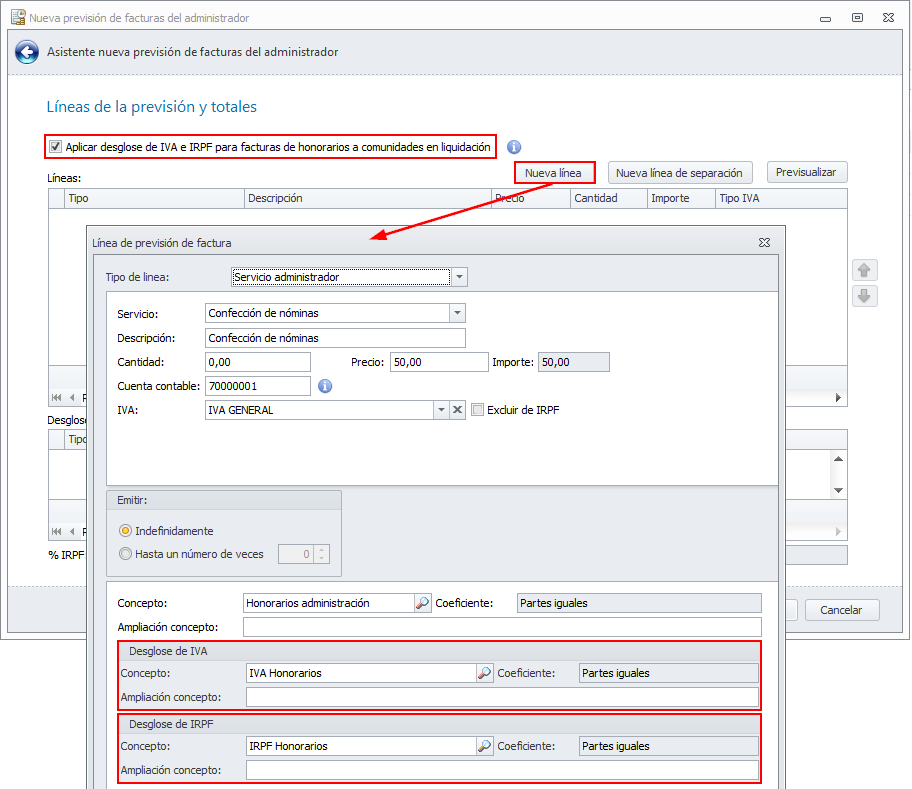 Se ha ampliado la funcionalidad de la casilla Aplicar desglose de IVA para facturas de honorarios a comunidades en liquidación. Esa misma casilla parametriza también ahora el desglose del IRPF, en caso de que lo haya.