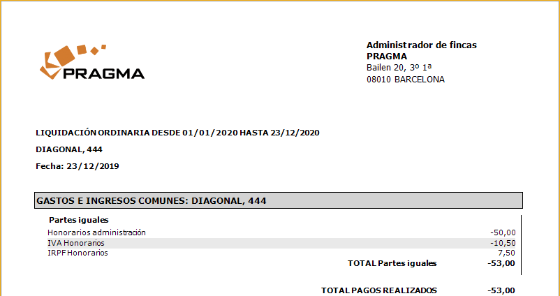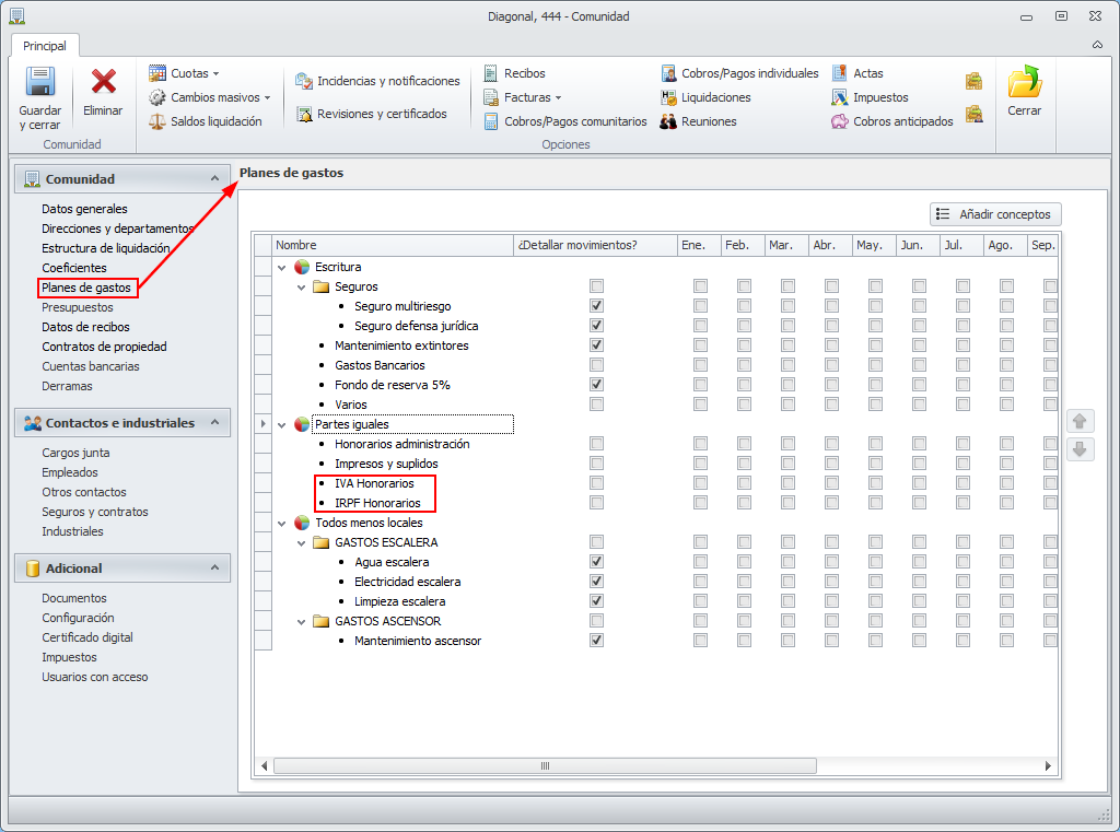Recuerde que para que se pueda detallar el IVA y el IRPF de los honorarios en la liquidación, debe tener sendos conceptos de gasto comunitario y debe tenerlos incorporados en el plan de gastos de las comunidades.