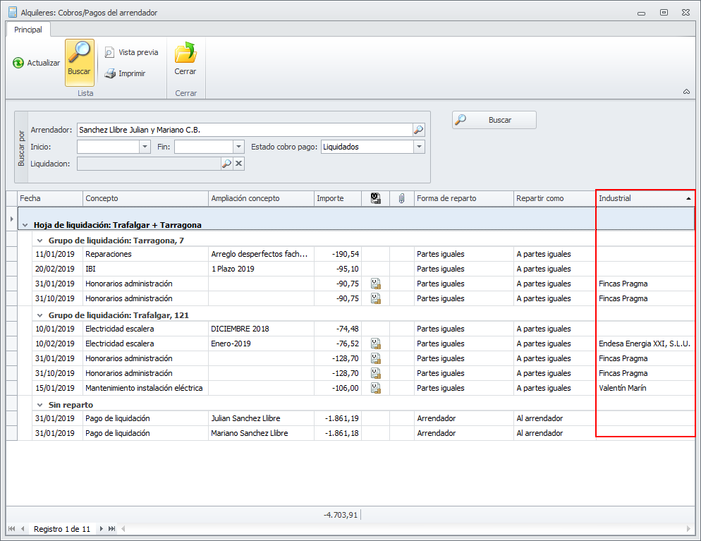 Columna para el industrial en la vista de cobros pagos del arrendador