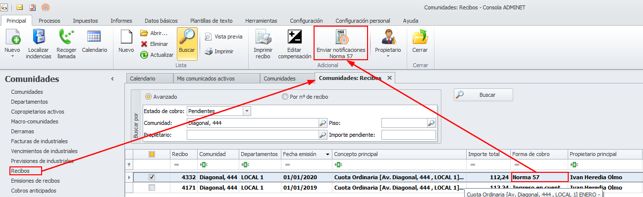 Se ha incorporado la posibilidad de emitir notificaciones de Norma 57 desde la vista de recibos de comunidades. El botón sólo se mostrará cuando se seleccione uno o varios recibos cuya forma de cobro sea Norma 57.