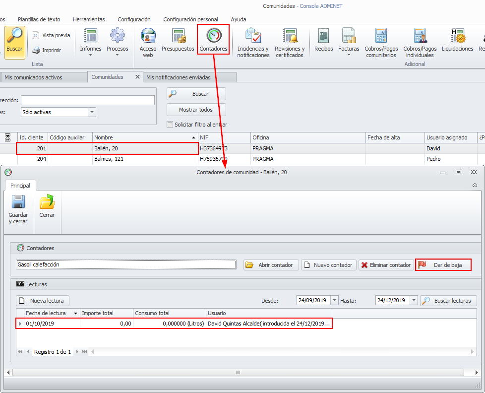 Se ha añadido, en la lista de contadores, la posibilidad de dar de baja un contador. Al darlo de baja, su información ya no se mostrará ni en liquidaciones, ni en estados de cuentas, ni en presupuestos.