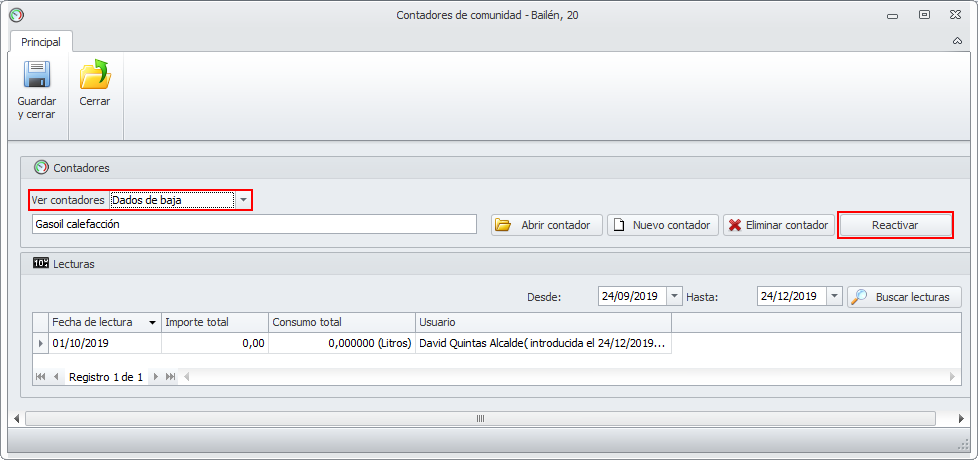 Un contador dado de baja puede ser reactivado, escogiendo Ver contadores dados de baja y usando el botón Reactivar.