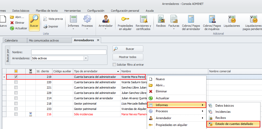 Se puede acceder al estado de cuentas detallado haciendo clic derecho sobre el arrendador o perceptor.