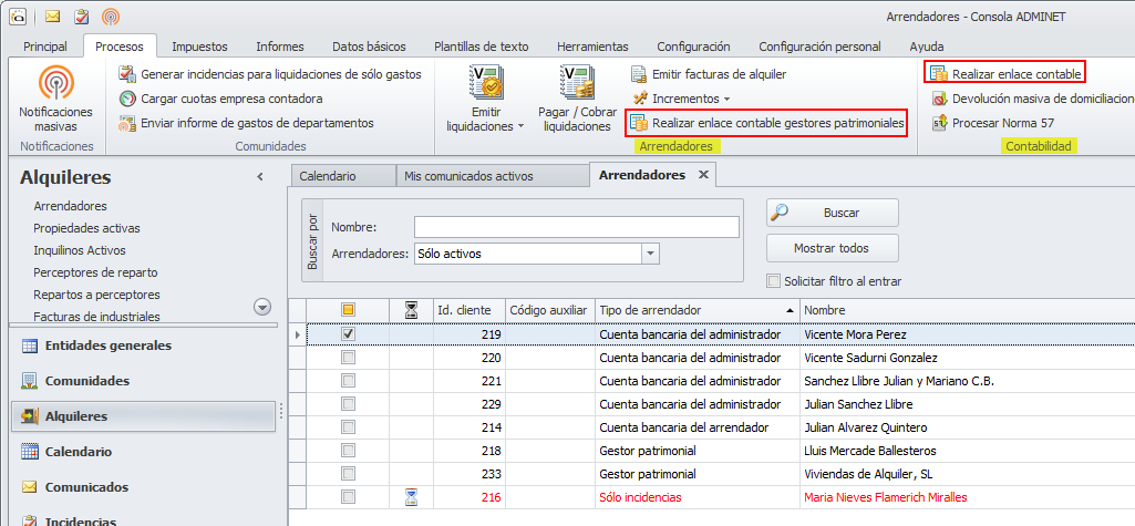 Se ha incorporado en el apartado Arrendadores del menú Procesos un nuevo botón para Realizar enlace contable de gestores patrimoniales. No debe confundirse este botón con el botón Realizar enlace contable del apartado Contabilidad. Este último realiza el enlace para la contabilidad del administrador.