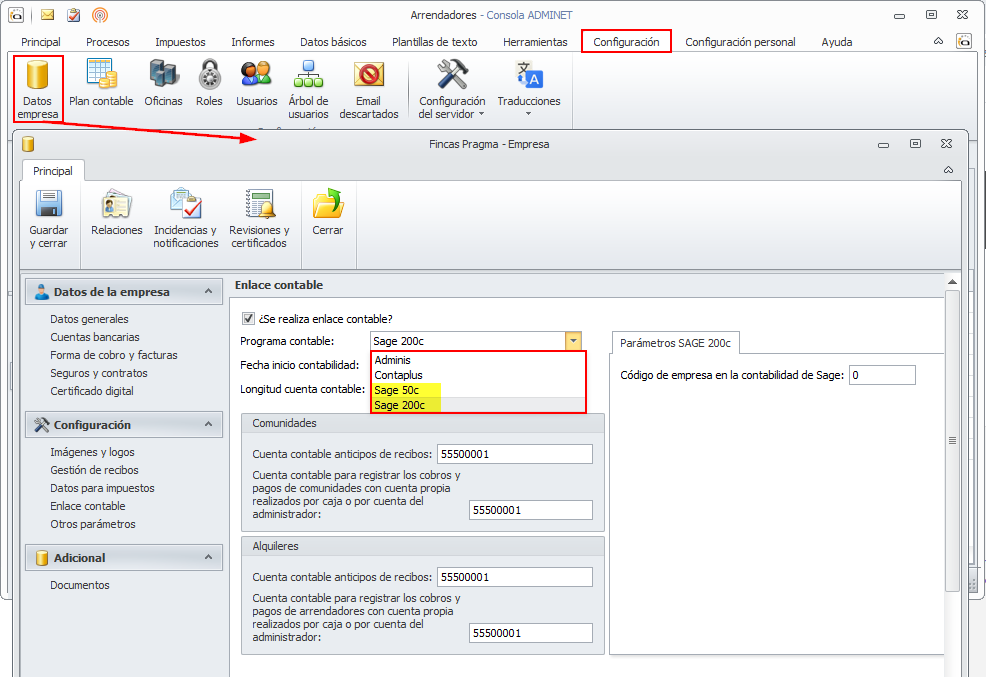 Se ha incorporado, en la ficha de Datos empresa, la posibilidad de enlazar con las contabilidades SAGE 50c y SAGE 200c.