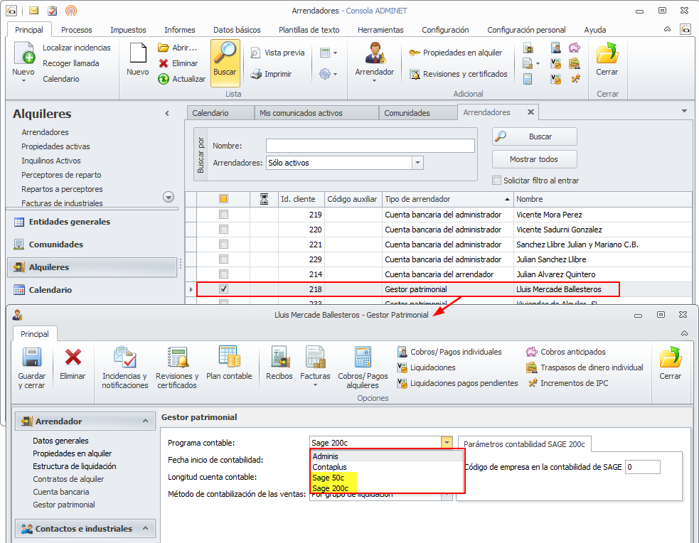 Se ha incorporado, en la pestaña Gestor patrimonial de la ficha del arrendador, la posibilidad de enlazar con las contabilidades SAGE 50c y SAGE 200c.