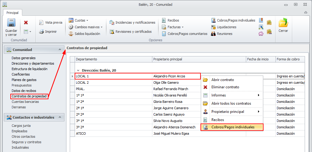 Dentro de la ficha de comunidad, se ha añadido la posibilidad, haciendo clic derecho sobre un contrato de propiedad, de acceder a sus cobros pagos individuales.