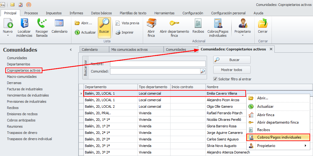 También se puede acceder a los cobros pagos individuales desde la opción Copropietarios activos del apartado Comunidades.