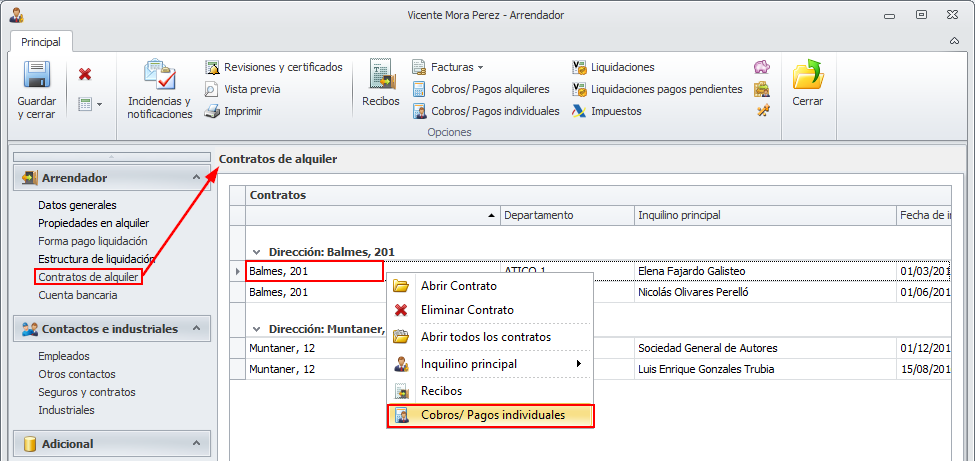 Dentro de la ficha del arrendador, se ha añadido la posibilidad, haciendo clic derecho sobre un contrato de alquiler, de acceder a sus cobros pagos individuales.