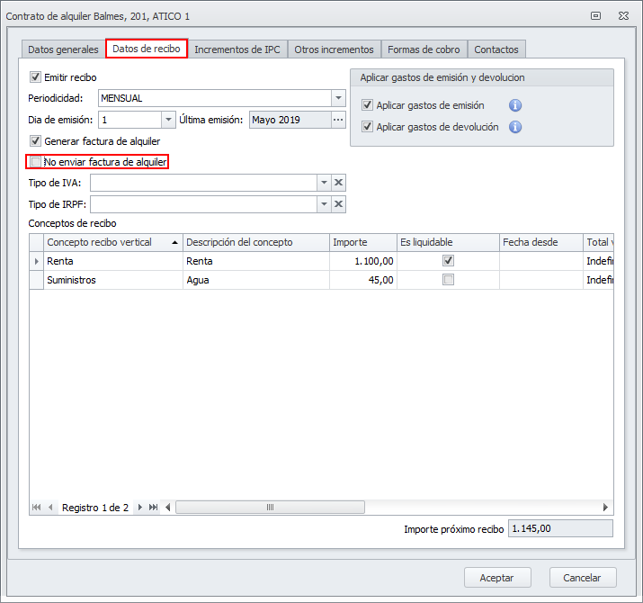 Se ha incorporado, en la pestaña Datos de recibo del contrato de alquiler, una nueva casilla con el texto No enviar factura de alquiler. Sólo es visible si está activada la casilla Generar factura de alquiler. Cuando la casilla No enviar factura de alquiler está activada, la factura se emite, pero no se le remite al inquilino.