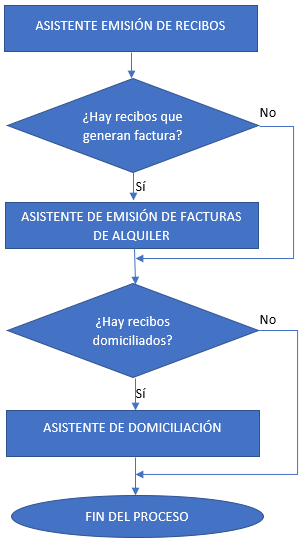 El asistente de emisión de recibos, al finalizar, analiza si la emisión incluye recibos que deban generar factura. Si es así, se abre automáticamente el asistente de emisión de facturas de alquiler. Cuando finaliza, sigue con el asistente de domiciliación. El esquema del proceso es el siguiente: