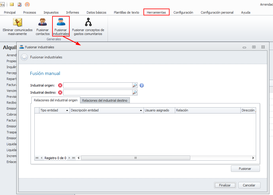 En industrial origen debe escoger el industrial que va a desaparecer. En industrial destino, el que va a añadir todas las relaciones que corresponden al industrial origen.