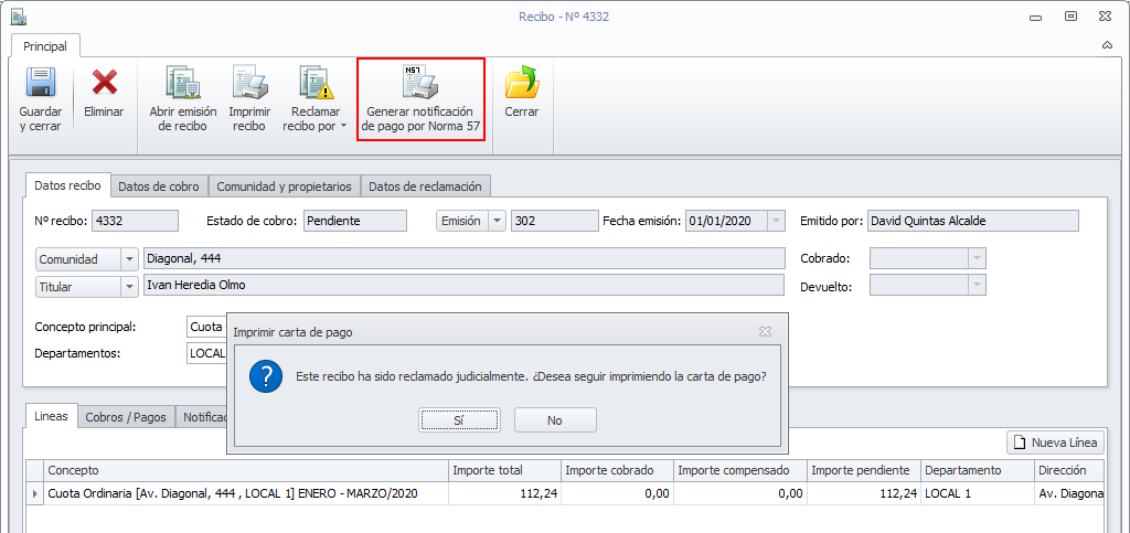 Comprobar si el recibo está reclamado judicialmente antes de imprimir la notificación de pago de Norma 57