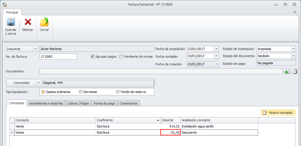 Se ha modificado la ficha de la factura de industriales a comunidades para permitir la introducción de líneas con importe positivo e importe negativo mezcladas.