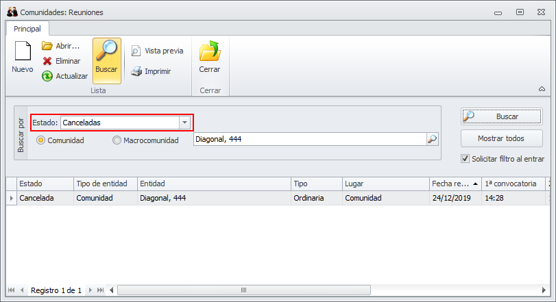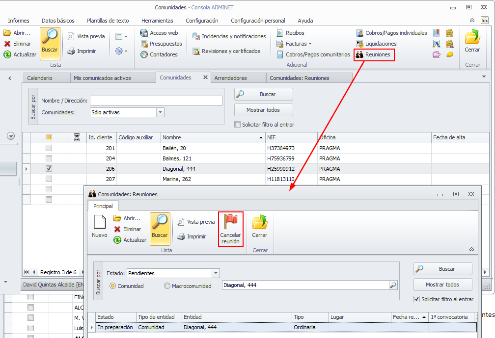 Se ha añadido un nuevo botón en la ventana de reuniones de comunidades para dar una reunión como cancelada.