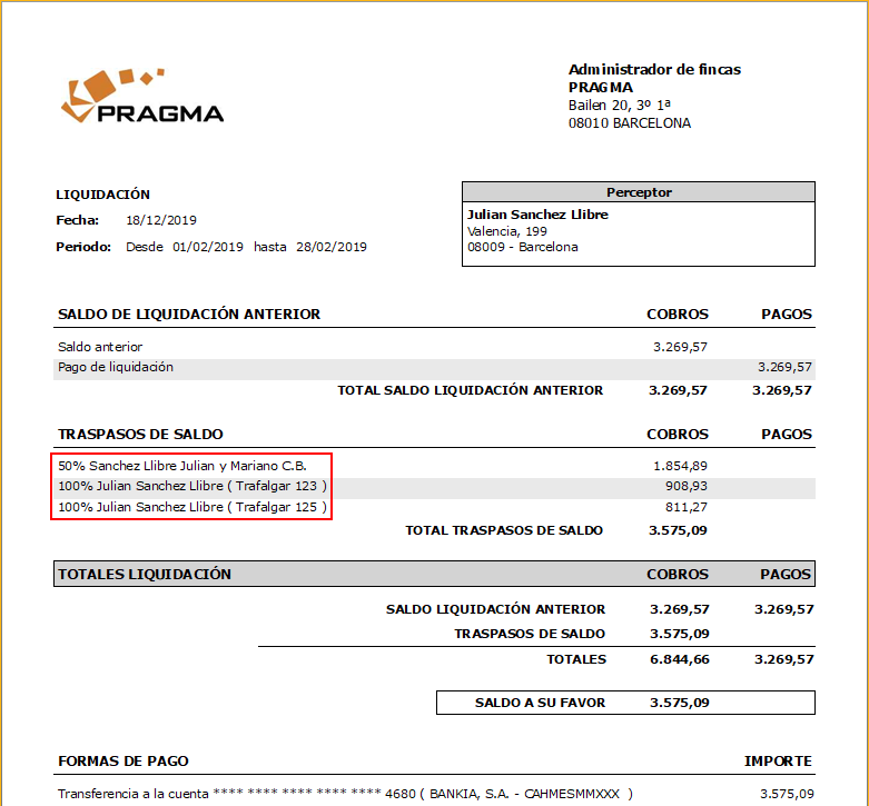 Se ha mejorado la información mostrada en la liquidación de perceptores de reparto, eliminando el texto Traspaso de saldo que se imprimía al principio de cada saldo percibido por el perceptor. La liquidación tiene ahora el siguiente aspecto.