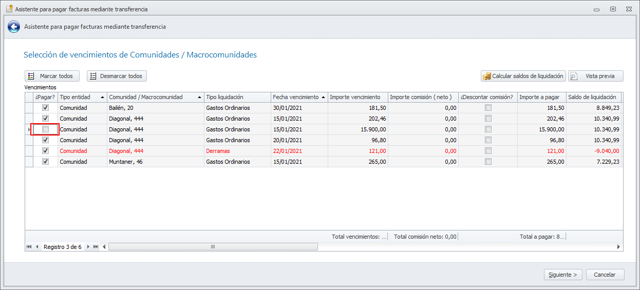 Al hacer clic en este botón se muestra por cada línea, en la columna Saldo liquidación, el saldo de la comunidad para la liquidación a la que corresponde la factura. La línea se mostrará en rojo si tras pagar las facturas seleccionadas, el saldo resulta negativo.