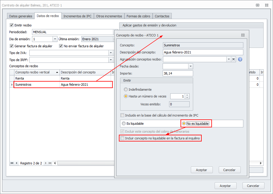 En la ficha de los conceptos de recibo del contrato de alquiler, se ha añadido una nueva casilla, que sólo se muestra cuando el concepto es No liquidable.