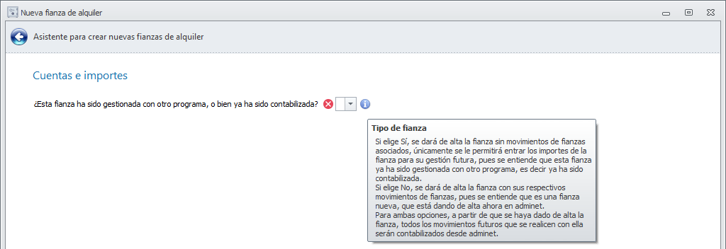 En el asistente de nueva fianza se añade una pregunta que permite distinguir entre una fianza que se gestiona íntegramente con adminet y otra que se ha gestionado con otro programa y se desea añadir para continuar llevándola desde adminet a partir de este momento.