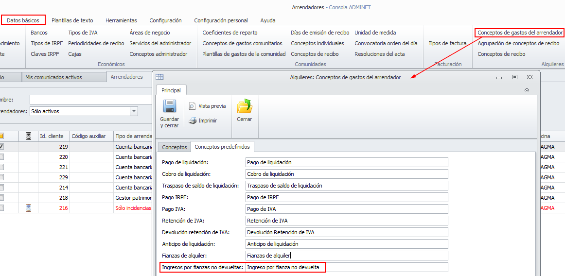 Nuevo concepto predefinido del arrendador para "Ingresos por fianzas no devueltas"